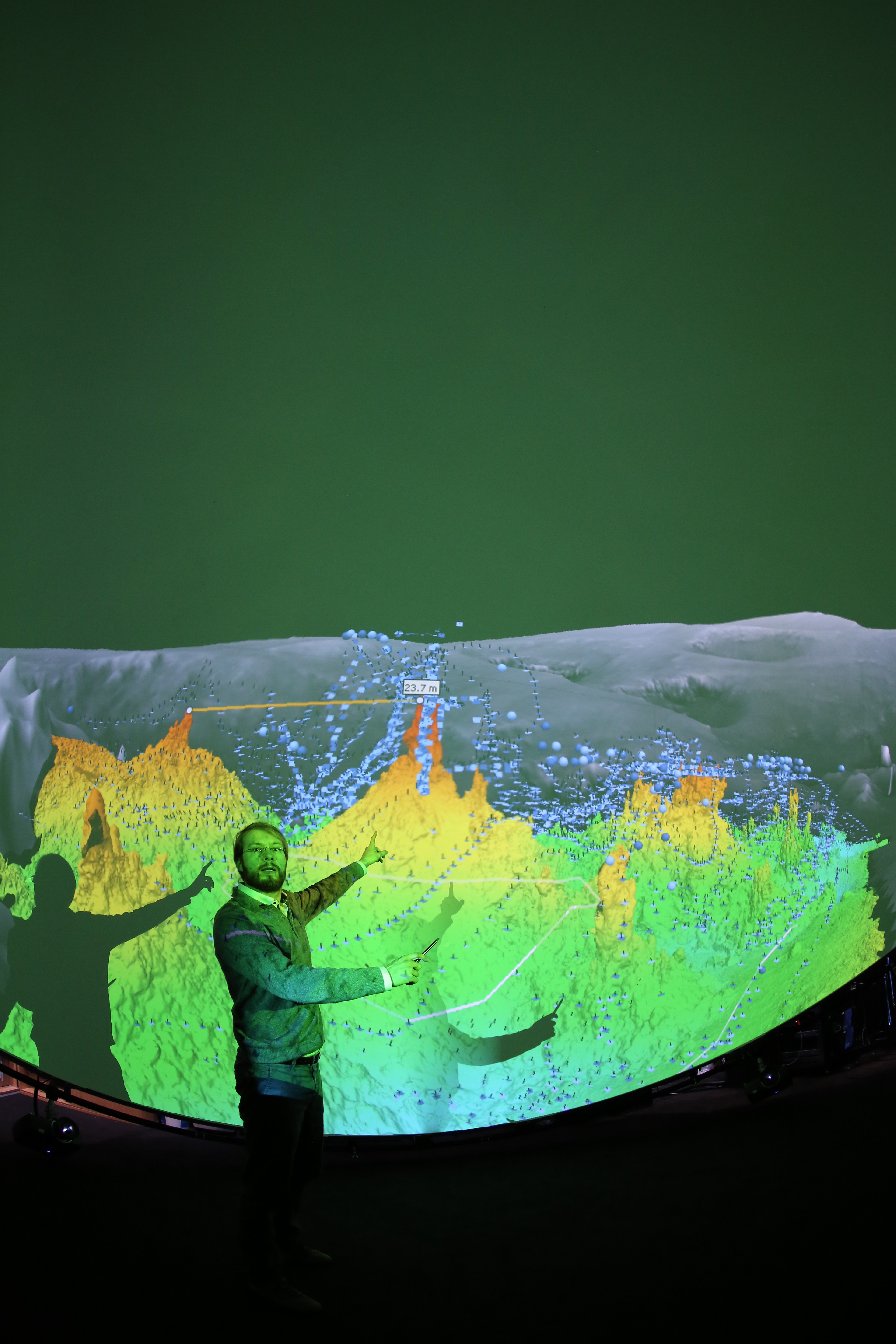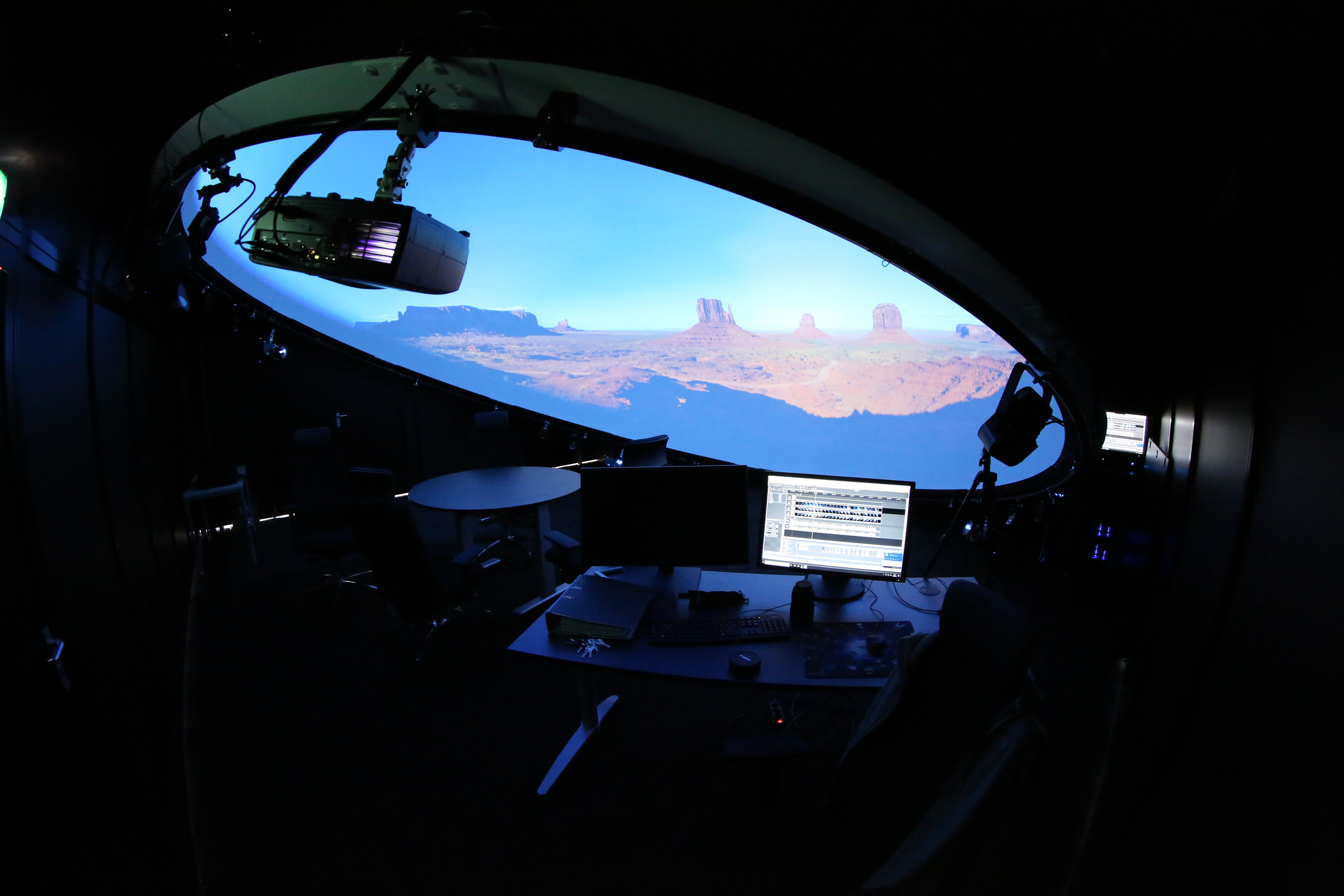 This dome is housed within a custom made 7m x 7m x 6m hangar within the Lithothek on the GEOMAR eastshore campus. A fiber glass reinforced projection dome of 6m diameter equipped with 5x Barco F50 projectors is suspended from the ceiling. Thus, the height above ground, tilt, and generally speaking the dome orientation can be arbitrarily chosen – a uniqe feature in the simulator and dome world. A Wings VIOSO media server supports playback of 60 Hz stereoscopic content at resolutions up to 4400 x 4400 pixels. Wings AVIO provides complete automation of all aspects of the lab. The system can be controlled from a cell phone.