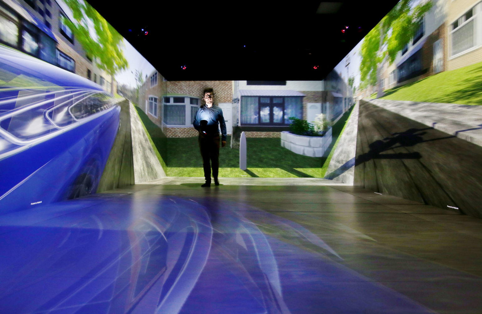 Hiker Cave at University of Leeds by Antycip Simulation is a 9x4m pedestrian simulation cave designed to support safe experimental research of pedestrian behavior. It is equipped with 7 Barco F90 projectors, a Vicon tracking camera array and can be easily recalibrated with Anyblend VR&SIM.